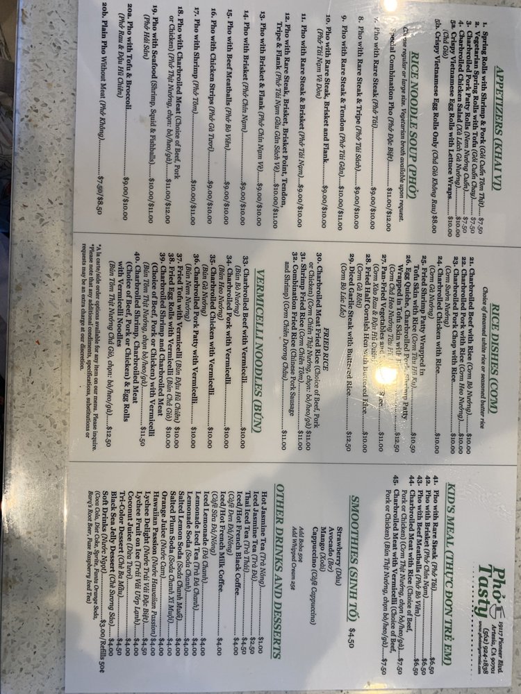 Located in Artesia, CA, Pho Tasty is a popular Vietnamese restaurant known for its delicious noodles and soup dishes. The menu offers a variety of options, including vegan and limited vegetarian choices. Customers praise the quick service, high-quality food, and cozy atmosphere. The menu includes traditional dishes like pho and com suong, all served with generous portions of noodles and flavorful toppings. Many reviewers recommend trying the grilled BBQ pork with pho for a satisfying and quick meal. With options for outdoor seating, catering, and happy hour specials, Pho Tasty is a versatile dining spot for groups, families, and solo diners alike. Visit Pho Tasty for an authentic Vietnamese dining experience in the heart of Southern California.